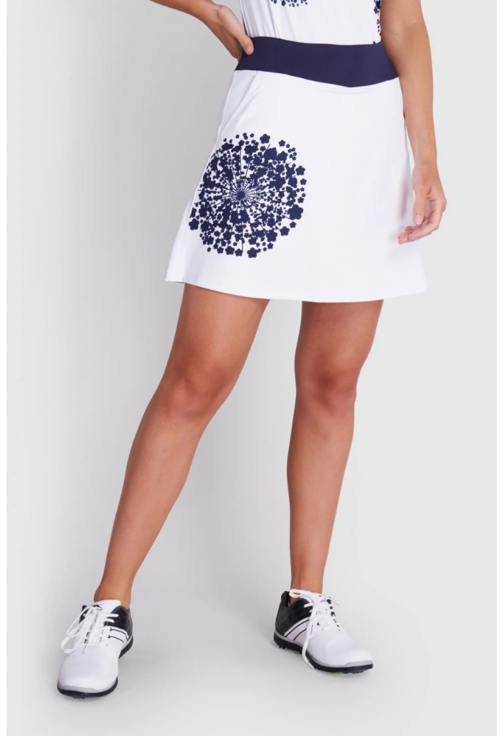 The Green Lamb Molly Printed Flared Skort will have you looking fabulous both on and off the course. The attractive dandelion print and contrasting waistband in a rich navy against a white background will be a welcome addition to your golfing wardrobe. Designed for optimum comfort, this practical skort uses the best in fabric tech and is quick drying, breathable and moisture wicking. Added comfort is achieved through the flattering flared shape, super stretchy inner shorts and wide, pull-on waistband. The Green Lamb Molly Printed Flared Skort will leave you with a winning performance.